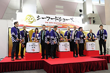 初日の開会式では、一般社団法人大日本水産会の白須敏朗会長が「万全なコロナ対策をしながら、規模を縮小して毎年開催してきた。シーフードショーは、出展者と来場者との真剣勝負の場。昨年より沢山の商談が成り立ち、水産物の商機拡大を願っている。リアルで式典ができるのも実に3年ぶり。鏡開きで大いに景気を付けたい」と挨拶し、当組合の井上正典理事長はじめ、関係者らが鏡開きを行い開幕。